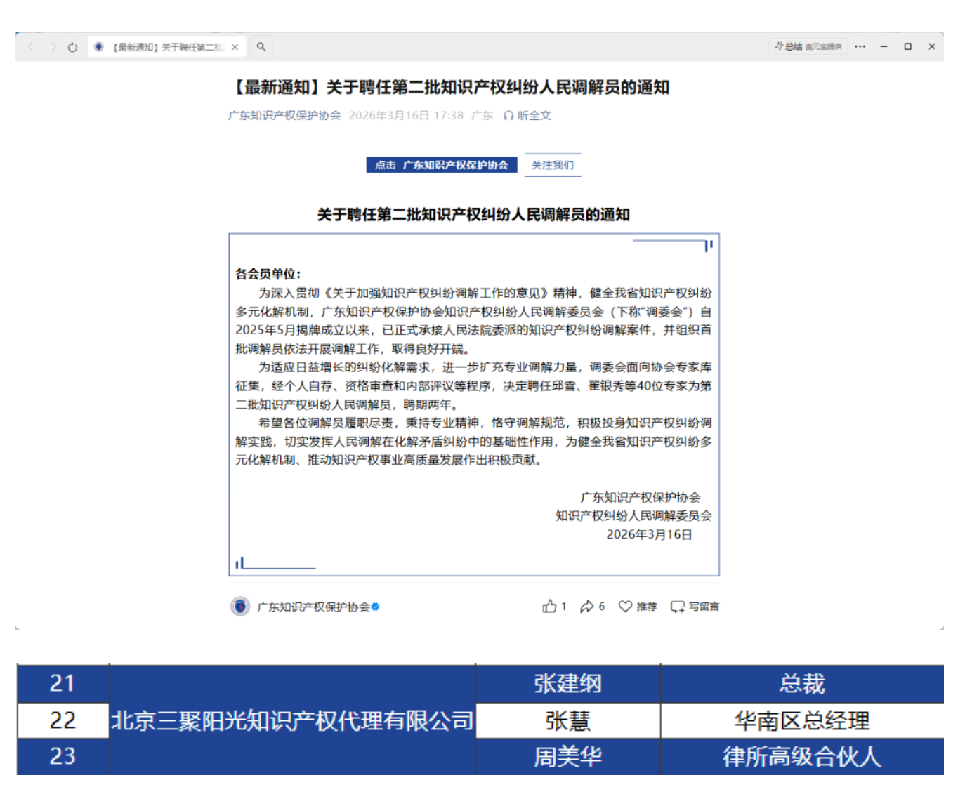 三聚陽光長期關(guān)注知識產(chǎn)權(quán)保護(hù)鏈條中的爭議預(yù)防、糾紛處置與協(xié)同保護(hù)。此前,三聚陽光曾赴中國(廣州)知識產(chǎn)權(quán)保護(hù)中心開展交流,就快速協(xié)同保護(hù)、維權(quán)援助、知識產(chǎn)權(quán)分析咨詢等議題進(jìn)行溝通;深圳地區(qū)主管單位也曾到訪三聚陽光北京總部調(diào)研。此次三位專業(yè)人士獲聘廣東省知識產(chǎn)權(quán)糾紛人民調(diào)解員,有望進(jìn)一步推動公司在華南地區(qū)更好參與知識產(chǎn)權(quán)糾紛多元化解實(shí)踐,為創(chuàng)新主體提供更專業(yè)、更高效、更具前瞻性的服務(wù)支持。