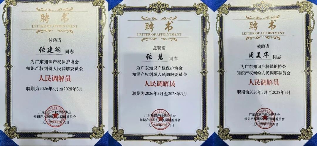 近日,三聚陽光總裁張建綱、華南區(qū)總經(jīng)理張慧、法律業(yè)務(wù)負(fù)責(zé)人周美華獲聘廣東省知識產(chǎn)權(quán)糾紛人民調(diào)解員。這一殊榮不僅是對三聚陽光專家團(tuán)隊(duì)個人專業(yè)素養(yǎng)的行業(yè)認(rèn)可,更是對三聚陽光長期致力于知識產(chǎn)權(quán)糾紛預(yù)防與化解、構(gòu)建和諧創(chuàng)新生態(tài)的高度肯定。