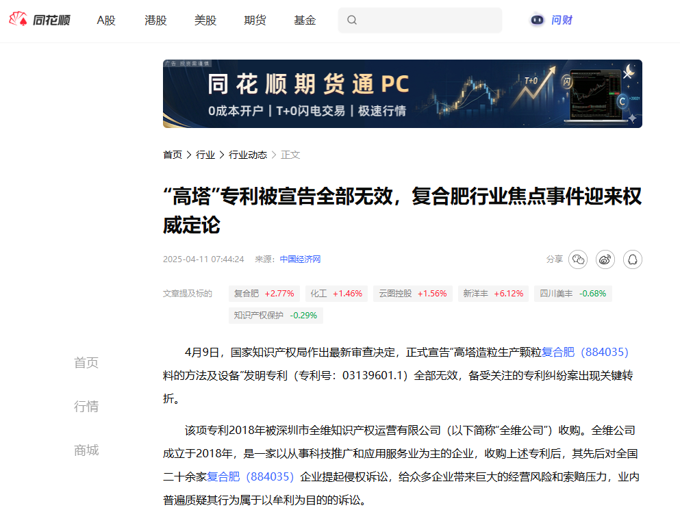 這起案件之所以具有代表性,一個(gè)重要原因在于它回應(yīng)了復(fù)合肥行業(yè)長(zhǎng)期受到關(guān)注的“問(wèn)題專利”治理難題。北京知識(shí)產(chǎn)權(quán)法院在年度案例中明確指出,高塔造粒是復(fù)合肥生產(chǎn)的主流工藝,國(guó)內(nèi)相關(guān)裝置數(shù)量眾多。涉案專利在被受讓后,曾被用于針對(duì)多家復(fù)合肥生產(chǎn)企業(yè)提起批量侵權(quán)訴訟,給企業(yè)正常經(jīng)營(yíng)和行業(yè)預(yù)期帶來(lái)較大影響。該案最終推動(dòng)涉案專利被宣告全部無(wú)效,相關(guān)訴訟亦因權(quán)利基礎(chǔ)喪失而終結(jié),從根本上消除了行業(yè)層面的侵權(quán)風(fēng)險(xiǎn)。