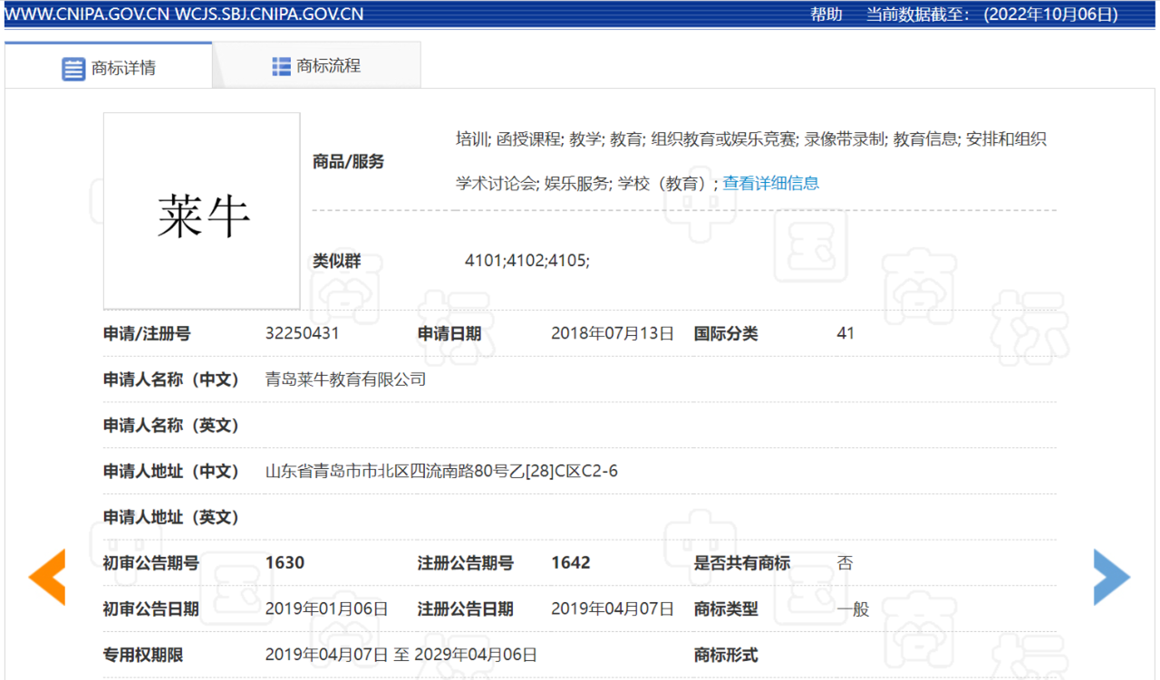 萊牛公司是從事大數(shù)據(jù)人才培養(yǎng)、IT軟件項(xiàng)目開(kāi)發(fā)和人才服務(wù)等業(yè)務(wù)的教育服務(wù)機(jī)構(gòu),已在全國(guó)設(shè)立多家分公司,并與多所高校等開(kāi)展合作。經(jīng)國(guó)家知識(shí)產(chǎn)權(quán)局商標(biāo)局核準(zhǔn)注冊(cè),萊牛公司享有第32250431號(hào)“萊?!鄙虡?biāo)的注冊(cè)商標(biāo)專用權(quán)。