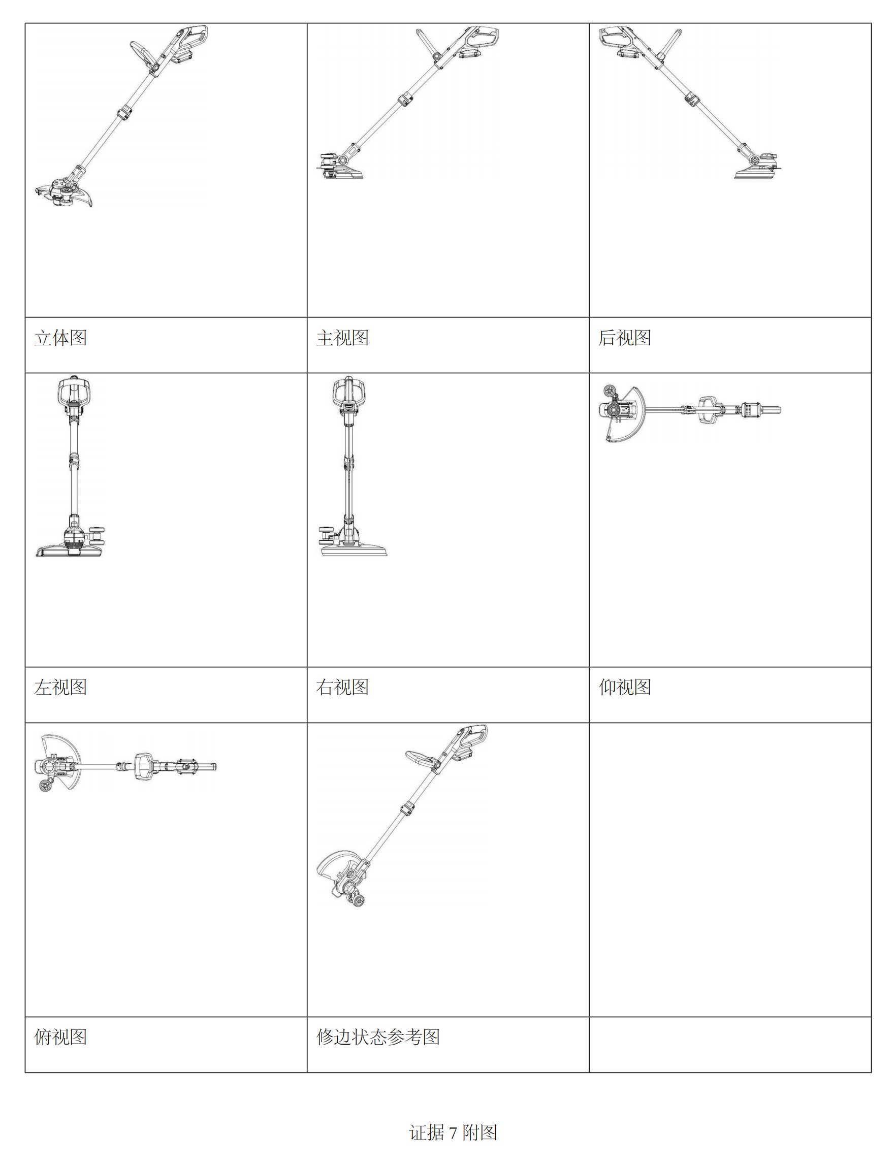 通過涉案專利與證據(jù) 7 的對比可知,兩者的整體部件組成及各部件的形狀和相對位置基本一致,上部為手柄,中間為桿體、桿體下方為電機(jī)、電機(jī)下方為鈍角扇形擋草板,二者相同點(diǎn)使得兩者給一般消費(fèi)者帶來了相似的整體視覺效果。一般消費(fèi)者經(jīng)過對涉案專利與證據(jù) 7的整體觀察可以看出,二者的差別對于產(chǎn)品外觀設(shè)計(jì)的整體視覺效果均不足以產(chǎn)生顯著影響,涉案專利與證據(jù) 7 相比不具有明顯區(qū)別,涉案專利不符合專利法第 23 條第 2 款的規(guī)定。