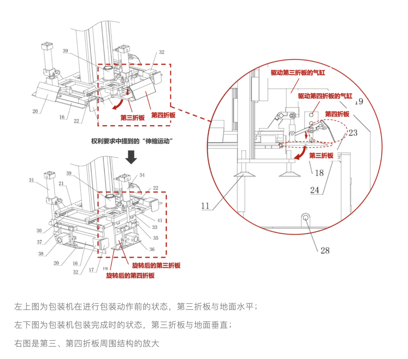 請(qǐng)注意動(dòng)圖及結(jié)構(gòu)圖中,第四折板的運(yùn)動(dòng)方式是“旋轉(zhuǎn)+平移”,即專(zhuān)利權(quán)利要求1中提到的用語(yǔ)“伸縮運(yùn)動(dòng)”。觀點(diǎn)列舉