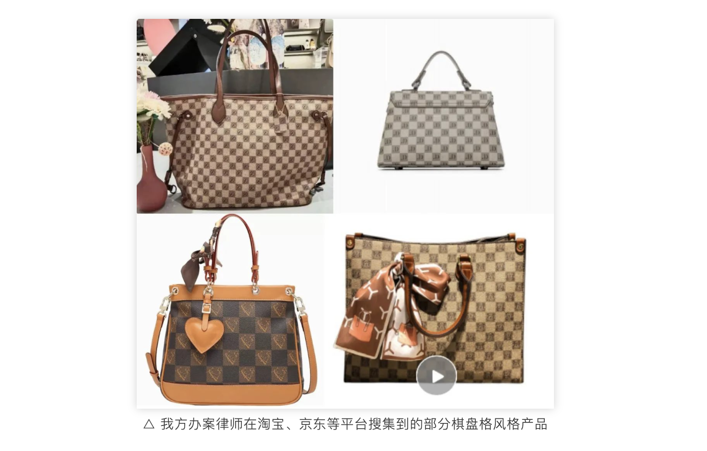 我方向法院證明,市場上有大量品牌的女包裝潢(可以通俗理解為外觀、款式)采取與案涉商標及案涉被告侵權(quán)產(chǎn)品類似的對某個元素進行棋盤式平鋪、斜鋪方式,故案涉圖形商標在女包行業(yè)的顯著性不強。