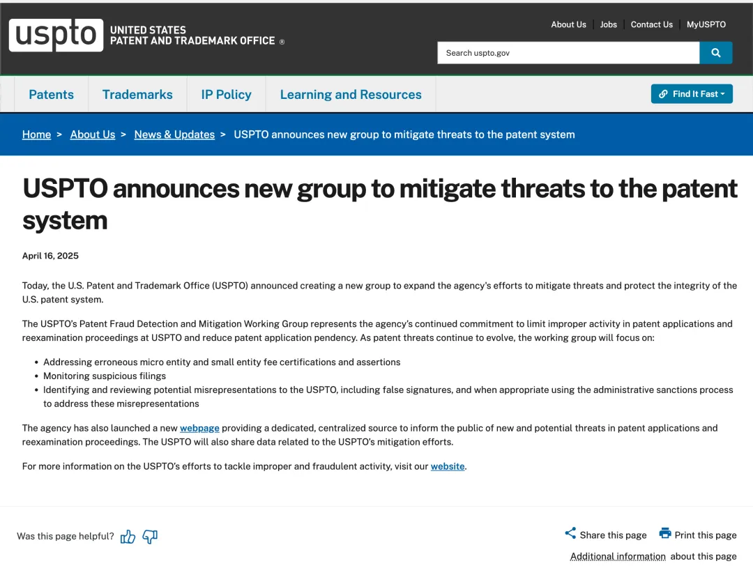 美國專利商標局(USPTO)于2025年4月16日正式宣布成立一個全新的工作組——專利欺詐檢測和緩解工作組 (The USPTO’s Patent Fraud Detection and Mitigation Working Group)。這一舉措明確顯示了USPTO意圖加強對專利申請及復(fù)審程序中不當(dāng)行為的監(jiān)管力度,旨在維護美國專利制度的嚴肅性和公信力。