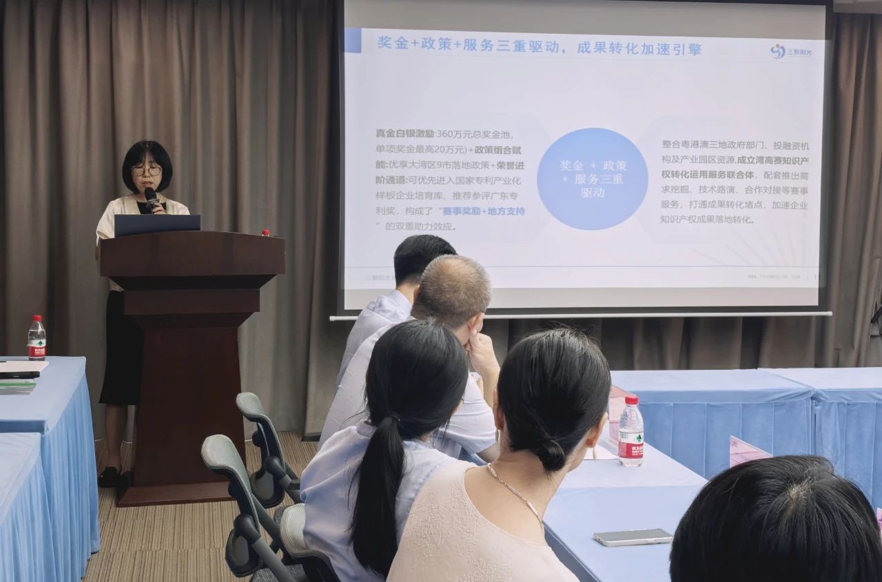 三聚陽光華南區(qū)項目總監(jiān)穆昭艷應(yīng)邀擔(dān)任主講嘉賓,她詳細介紹了第三屆佛山高價值專利成果轉(zhuǎn)移轉(zhuǎn)化大賽、2025年粵港澳大灣區(qū)高價值知識產(chǎn)權(quán)培育布局大賽以及第二屆長江經(jīng)濟帶高價值專利轉(zhuǎn)化運用大賽的賽事背景、規(guī)則及申報策略。穆昭艷強調(diào),通過高價值專利賽事,企業(yè)能夠精準布局知識產(chǎn)權(quán)保護,提升市場競爭力,并實現(xiàn)技術(shù)成果高效轉(zhuǎn)化。