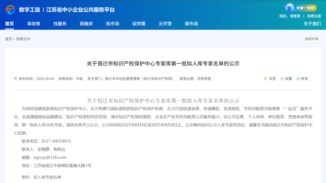 宿遷市知產(chǎn)保護(hù)中心專家?guī)於ㄎ挥凇翱焖賹彶椤焖俅_權(quán)—快速維權(quán)—專利導(dǎo)航”的一站式公共服務(wù)平臺(tái),重點(diǎn)覆蓋商標(biāo)品牌建設(shè)、侵權(quán)判定咨詢、海外維權(quán)援助與產(chǎn)業(yè)專利導(dǎo)航等方向,旨在以專家智力支撐地方創(chuàng)新主體高質(zhì)量發(fā)展。